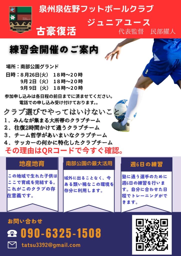 泉州泉佐野FCジュニアコースでは、下記の日程で練習会を開催いたします。